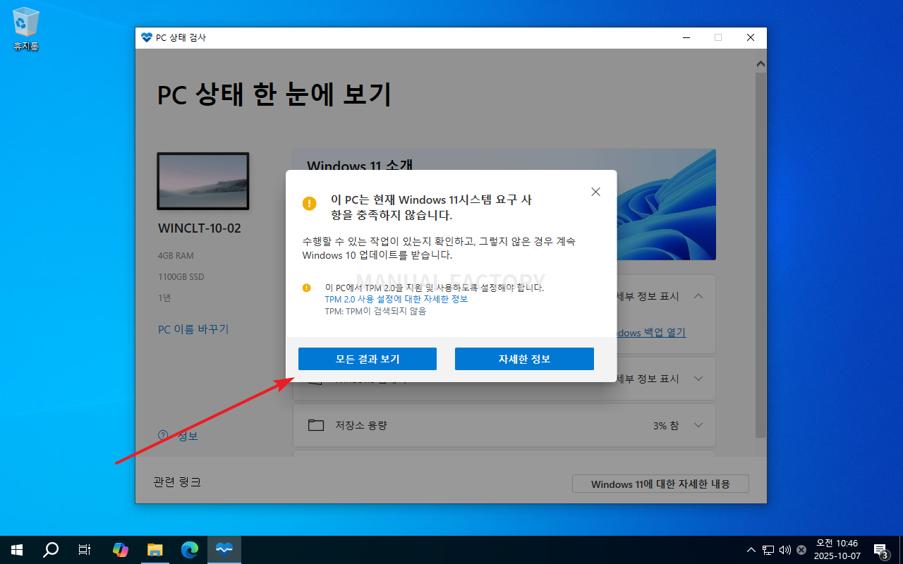 - 윈도우 11의 시스템 요구 사항을 충족하는지 결과를 보여줍니다. 아래는 TPM 2.0 미지원으로 시스템 요구 사항을 충족하지 못한다는 화면이고, [모든 결과 보기]를 클릭하면...