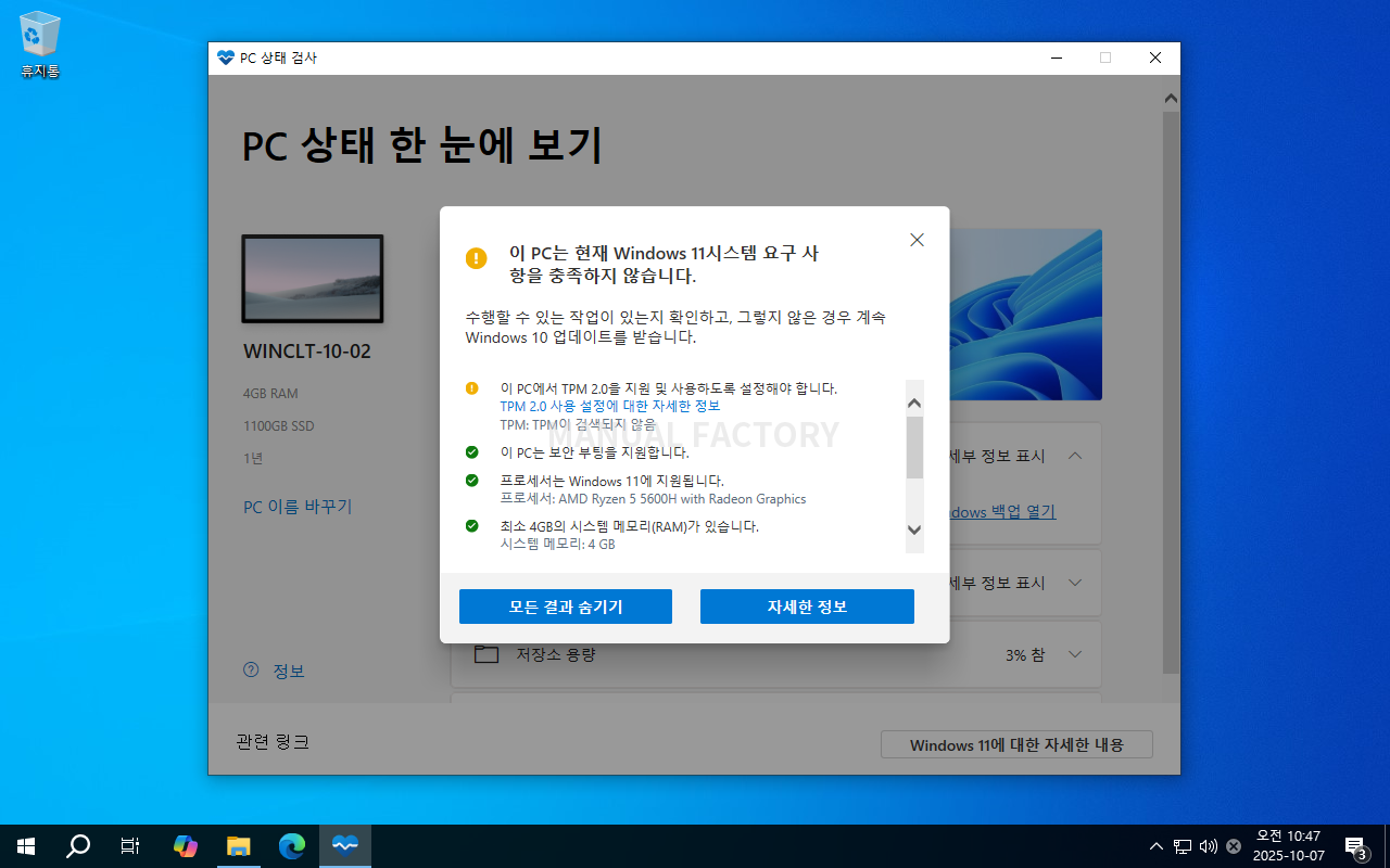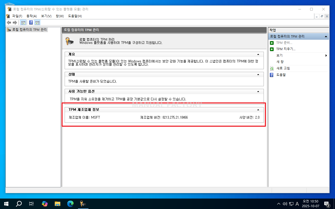- TPM 2.0 지원 여부를 확인할 수 있습니다.